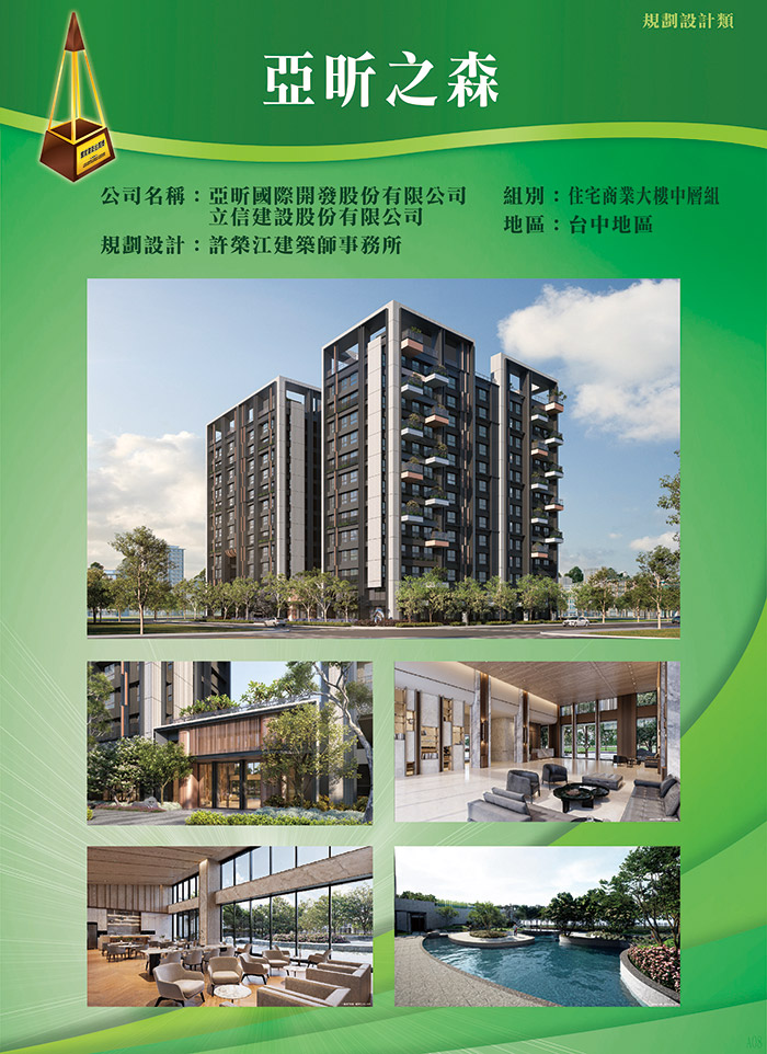 | 住宅商業大樓中層組 | 亞昕之森 | 亞昕國際開發股份有限公司 立信建設股份有限公司 |