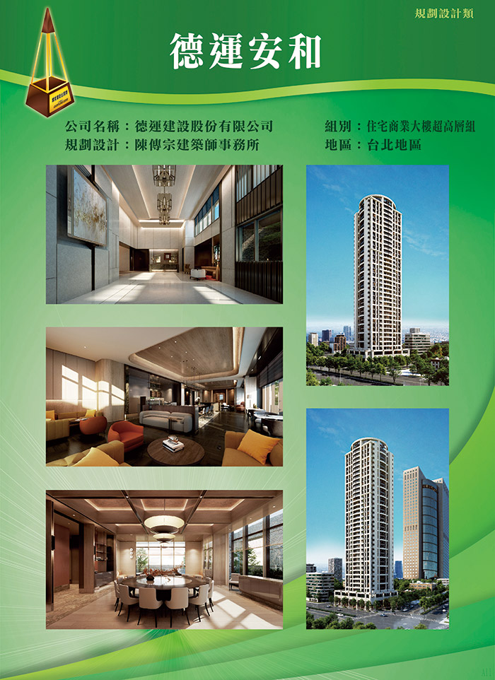 | 住宅商業大樓超高層組 | 德運安和 | 德運建設股份有限公司 | 台北地區 |