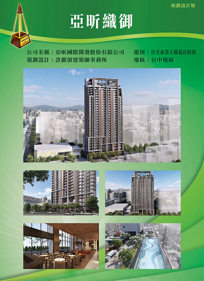 | 住宅商業大樓超高層組 | 亞昕織御 | 亞昕國際開發股份有限公司 | 台中地區 |