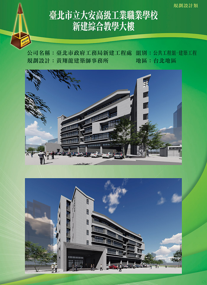 | 公共工程/建築工程組 | 臺北市立大安高級工業職業學校新建綜合教學大樓 | 臺北市政府工務局新建工程處 | 台北地區 |