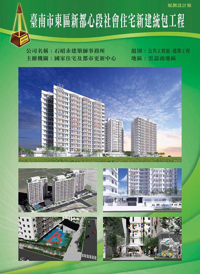 | 公共工程/建築工程組 | 臺南市東區新都心段社會住宅新建統包工程 | 石昭永建築師事務所 | 雲嘉南地區 |