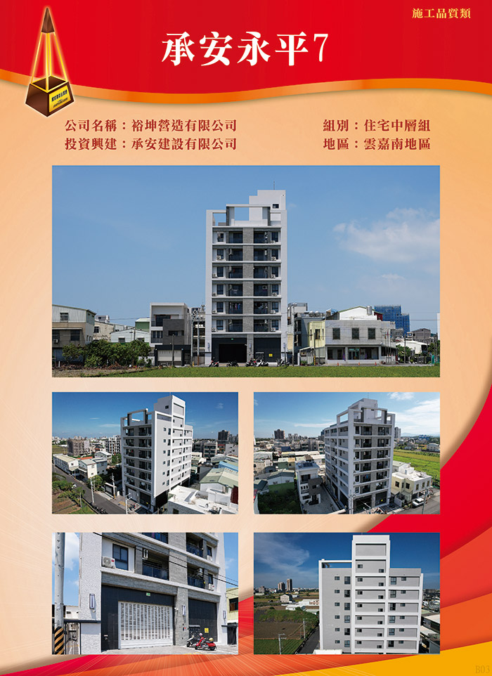 | 住宅中層組 | 承安永平7 | 裕坤營造有限公司 | 雲嘉南地區 |