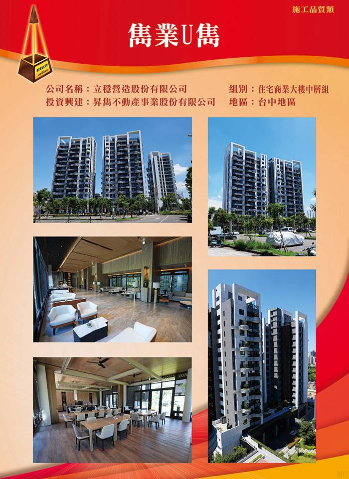| 住宅商業大樓中層組 | 雋業U雋 | 立穩營造股份有限公司 | 台中地區 |