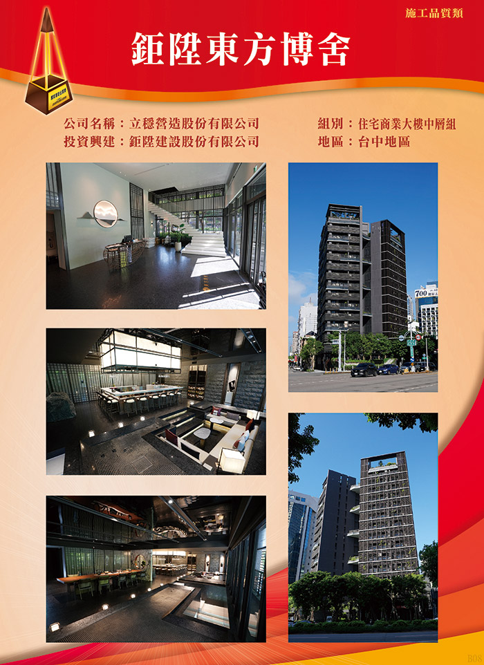 | 住宅商業大樓中層組 | 鉅陞東方博舍 | 立穩營造股份有限公司 | 台中地區 |