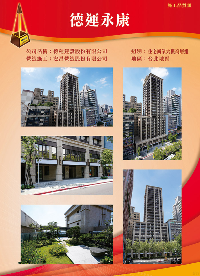 | 住宅商業大樓高層組 | 德運永康 | 德運建設股份有限公司 | 台北地區 |