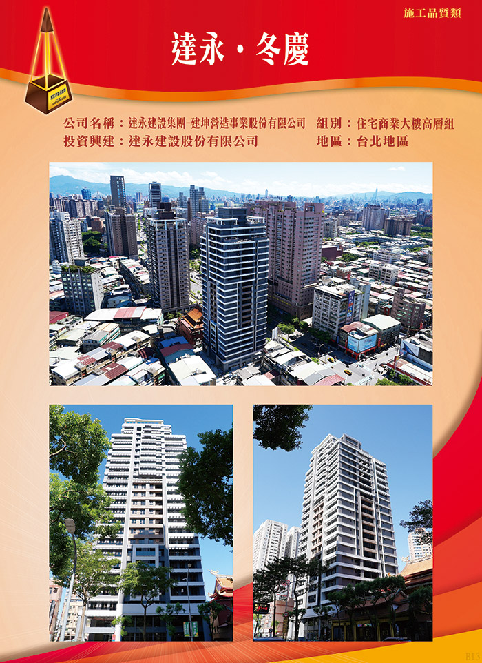 | 住宅商業大樓高層組 | 達永‧冬慶 | 達永建設集團-建坤營造事業股份有限公司 | 台北地區 |