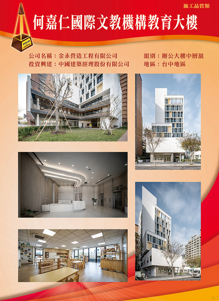| 辦公大樓/中層組 | 何嘉仁國際文教機構教育大樓 | 金永營造工程有限公司 | 台中地區 |