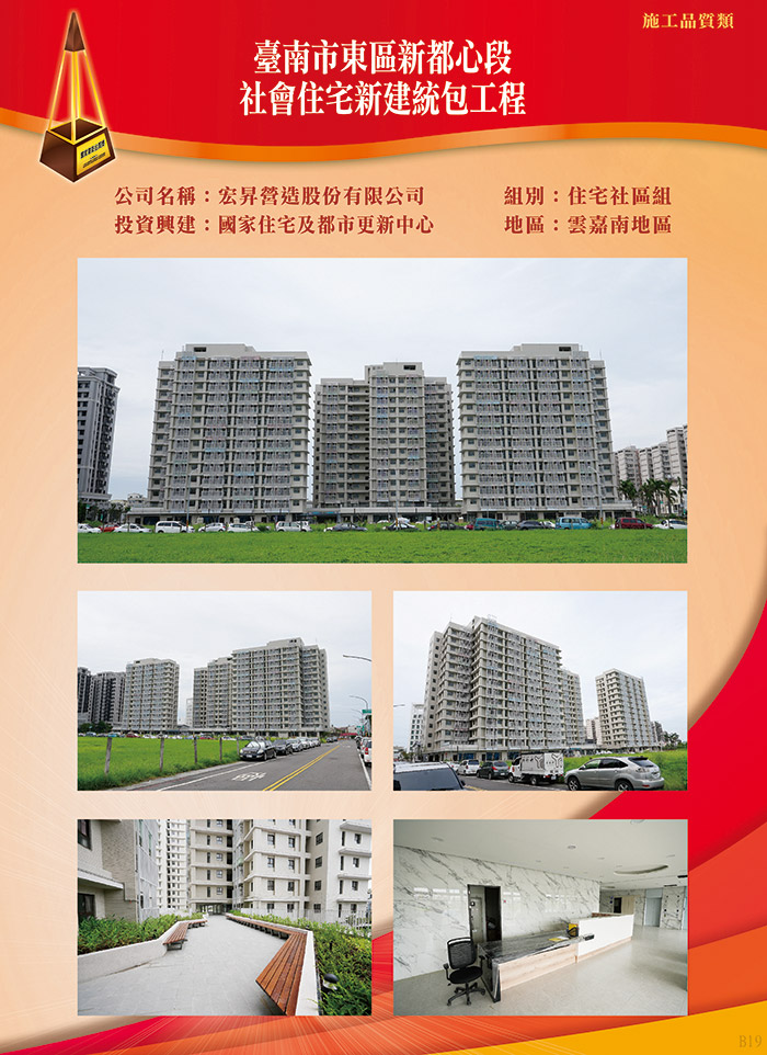 | 住宅社區組 | 臺南市東區新都心段社會住宅新建統包工程 | 宏昇營造股份有限公司 | 雲嘉南地區 |