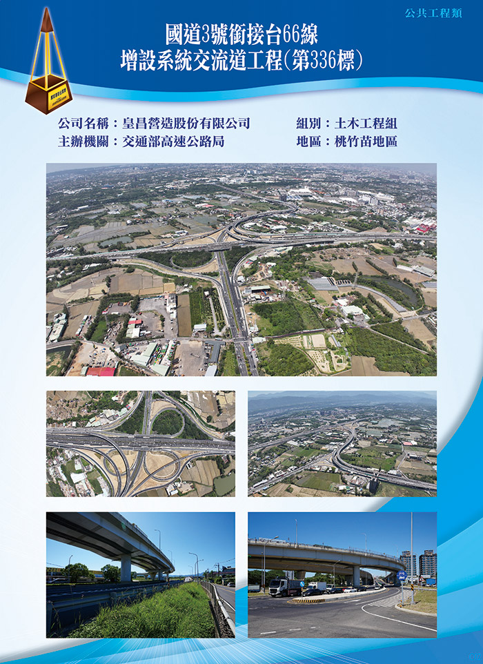 | 土木工程組─公路工程 | 國道3號銜接台66線增設系統交流道工程(第336標) | 皇昌營造股份有限公司 | 桃竹苗地區 |