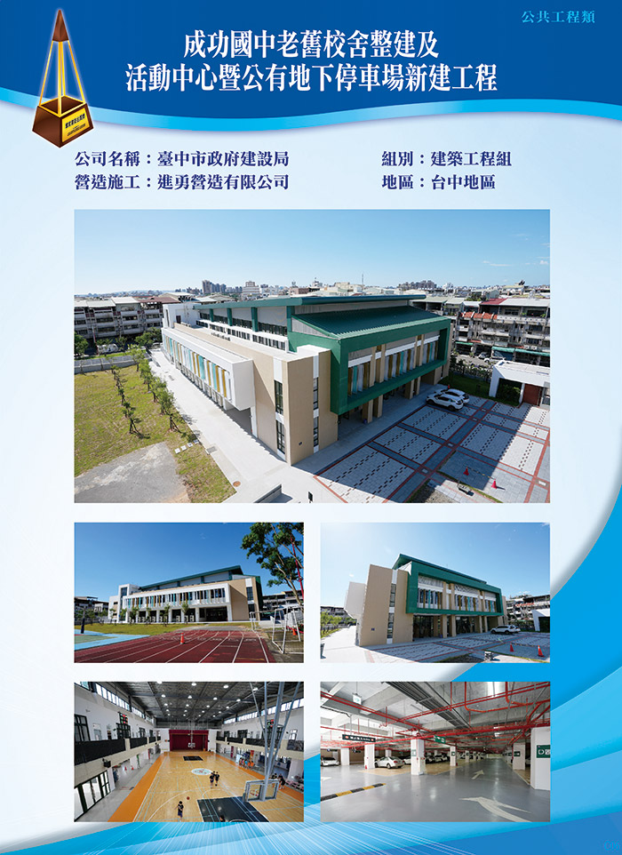 | 建築工程組─休閒文教.學校 | 成功國中老舊校舍整建及活動中心暨公有地下停車場新建工程 | 臺中市政府建設局 | 台中地區 |