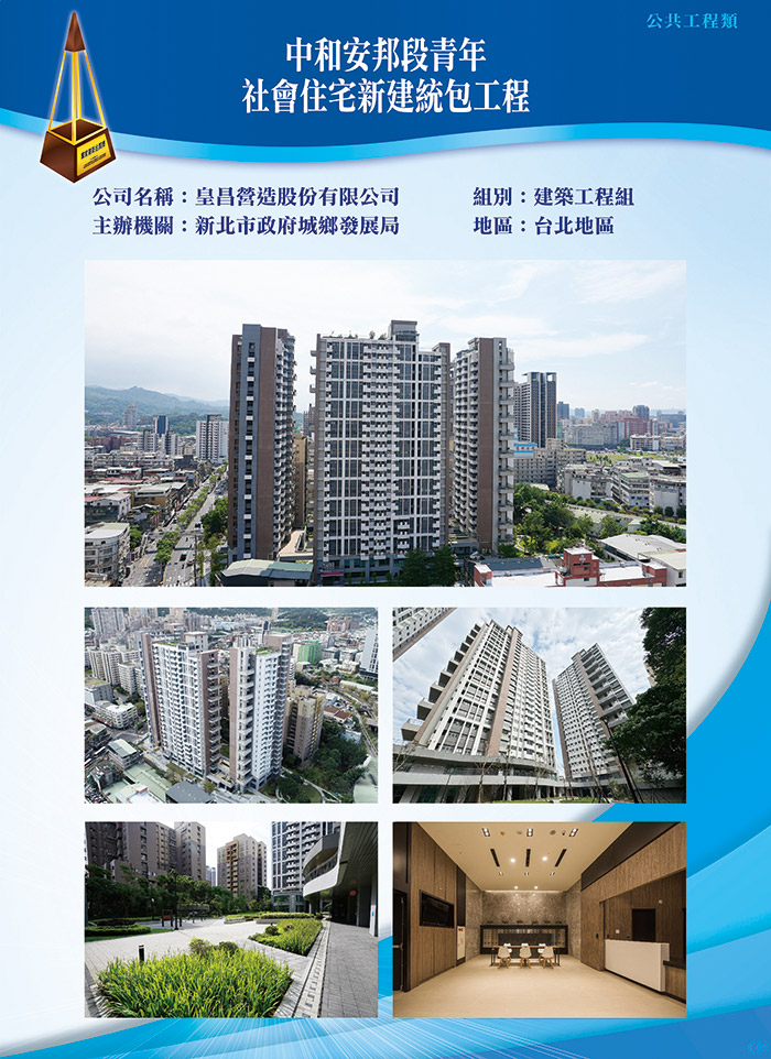 | 建築工程組─社會住宅 | 中和安邦段青年社會住宅新建統包工程 | 皇昌營造股份有限公司 |