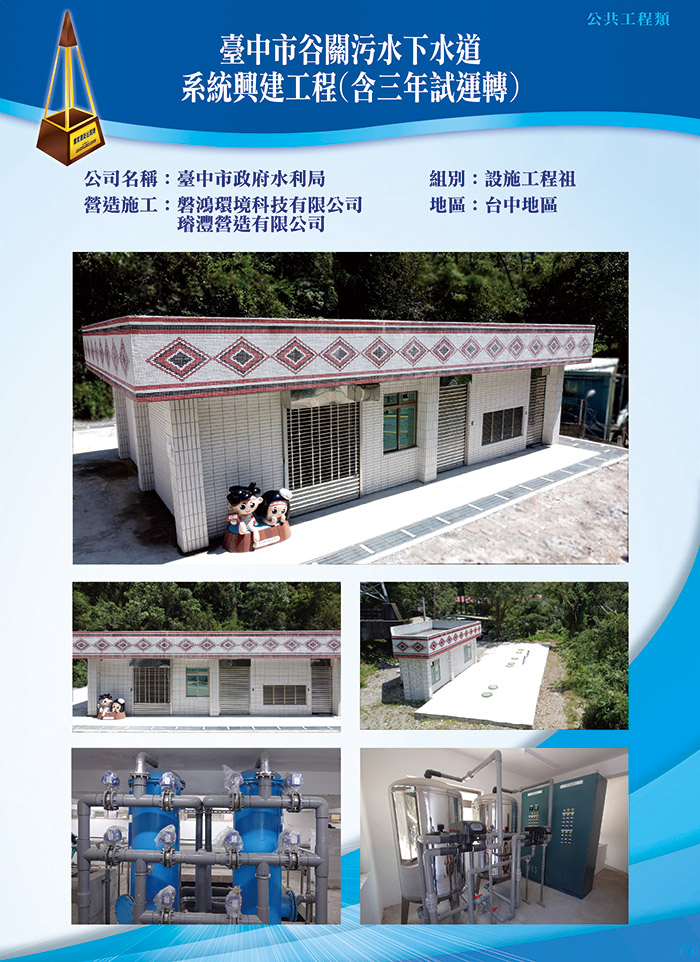 | 設施工程組─污水處理廠工程 | 臺中市谷關污水下水道系統興建工程(含三年試運轉) | 臺中市政府水利局 | 台中地區 |